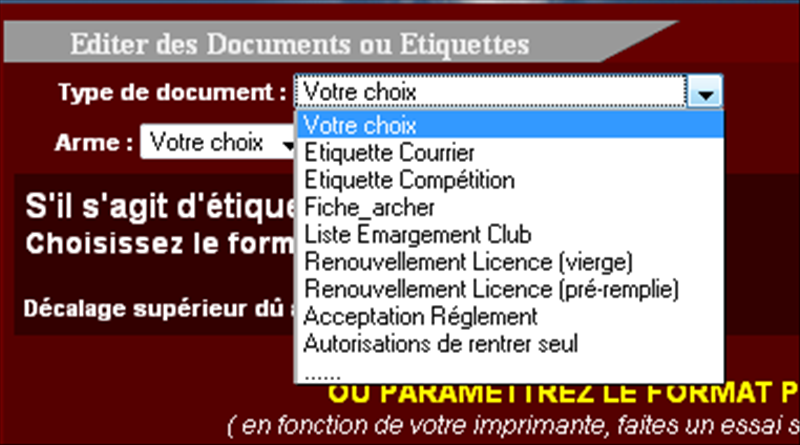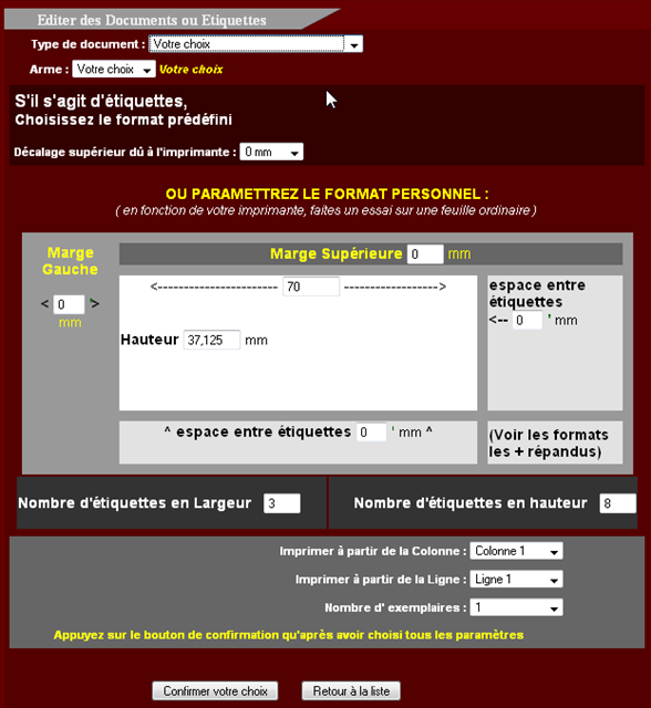 Sélectionner éventuellement le format et différents paramètres d'impression et définir la colonne et la ligne à partir desquelles l'édition d'étiquettes débutera