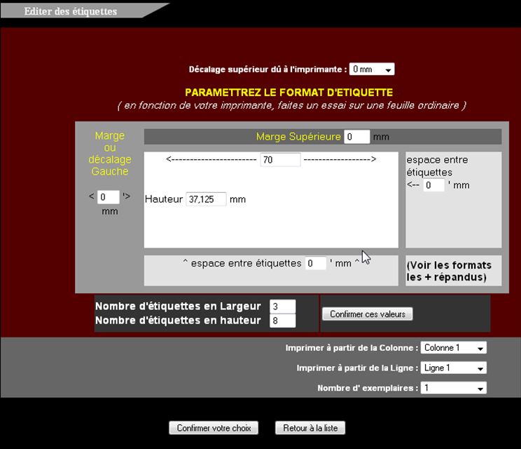vous disposez de différents règlages pour adapter le document au format de papier ou d'étiquettes et à votre imprimante ( décalage vertical éventuel )